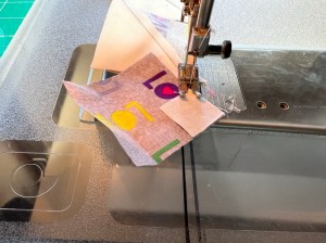 Draw a diagonal line on all the white squares, line them up with a color square, and sew 1/4 inch away from the line on both sides, using the line as the guide for the edge of your presser foot.