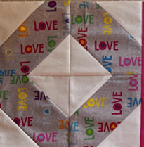 For Row 3: sew a 10 1/2 inch white strip to the right side of a heart block and a 12 inch strip to the bottom of that same heart. Sew a 10 1/2 inch strip to the bottom of an O block. Join with a large white square and the 12 inch pink strips as pictured above.