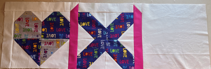For Row 2: Sew a 10 1/2 inch white strip to the left of an O block and the right of an X block. Sew a pink 10 1/2 inch strip to each side of a heart block and join together as pictured above.