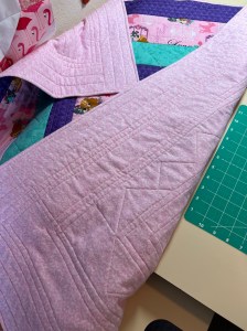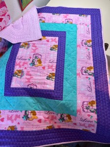 I managed to work with some more pink fabric for the month of February. I am doing a demo for our church quilting group next week for a Quilt as You Go for Project Linus. I wanted to have a model to show them the finished project, plus wanted to try out all my measurements ahead of time. This Lady and the Tramp fabric has been in my stash for ages. The green is a scrap from a recent backing, the purple and flannel backing purchased recently.