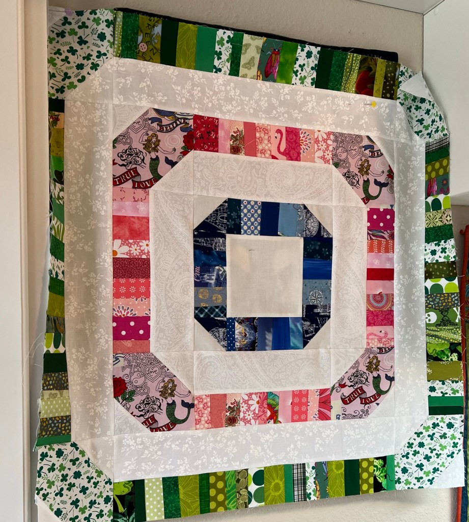 I was really disappointed to start my green rows for this quilt, only to find out that I had pieced my flamingo corners wrong and they had to go! And no more FLAMINGO fabric. (please ignore the stained ironing board- I have fabric for a new cover but can’t locate the staple gun out in the messy garage!)