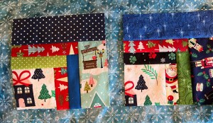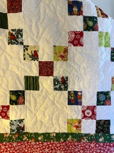 Here is a close up of the scraps and quilting. I have started another Christmas scrap quilt, using the Christmas village flannel that is on the back of this quilt. It has become the centers of my scrappy blocks.