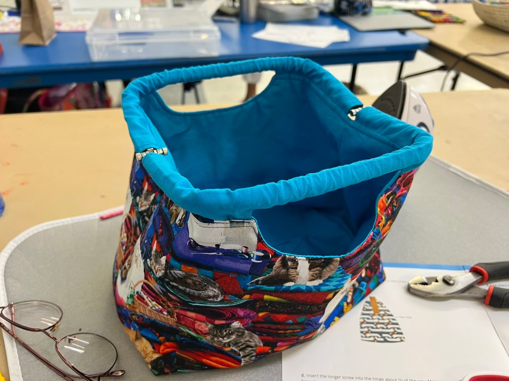 It has a snap ring that holds it open or closed. I chose the outside fabric and when I was trying to decide on a lining, my husband and best quilting advisor said it needed the solid. I have some great fabrics in my stash but not always great coordinating fabrics so the solid was the best choice and I am glad I went with it. It worked out nicely, I think.