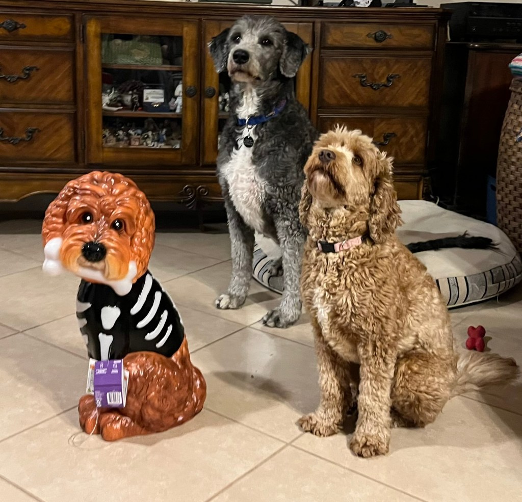 I leave you with a picture of my fur babies as I head up to sew today. Mayzie would not get closer to her duplicate (purchased at Lowe’s), even with the temptation of roasted chicken. Cosmo, my big boy, would have cuddled with the thing if it got him another bite though.