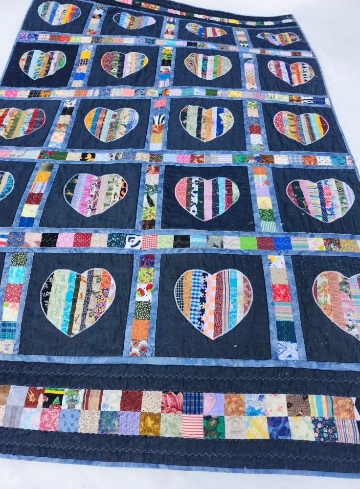So, I prepped all the denim blocks with a bit of interfacing since it had a little stretch to it and now, I still need to trim out all the heart centers, leaving about 1/4-inch edge so that it will ravel once sewn on.