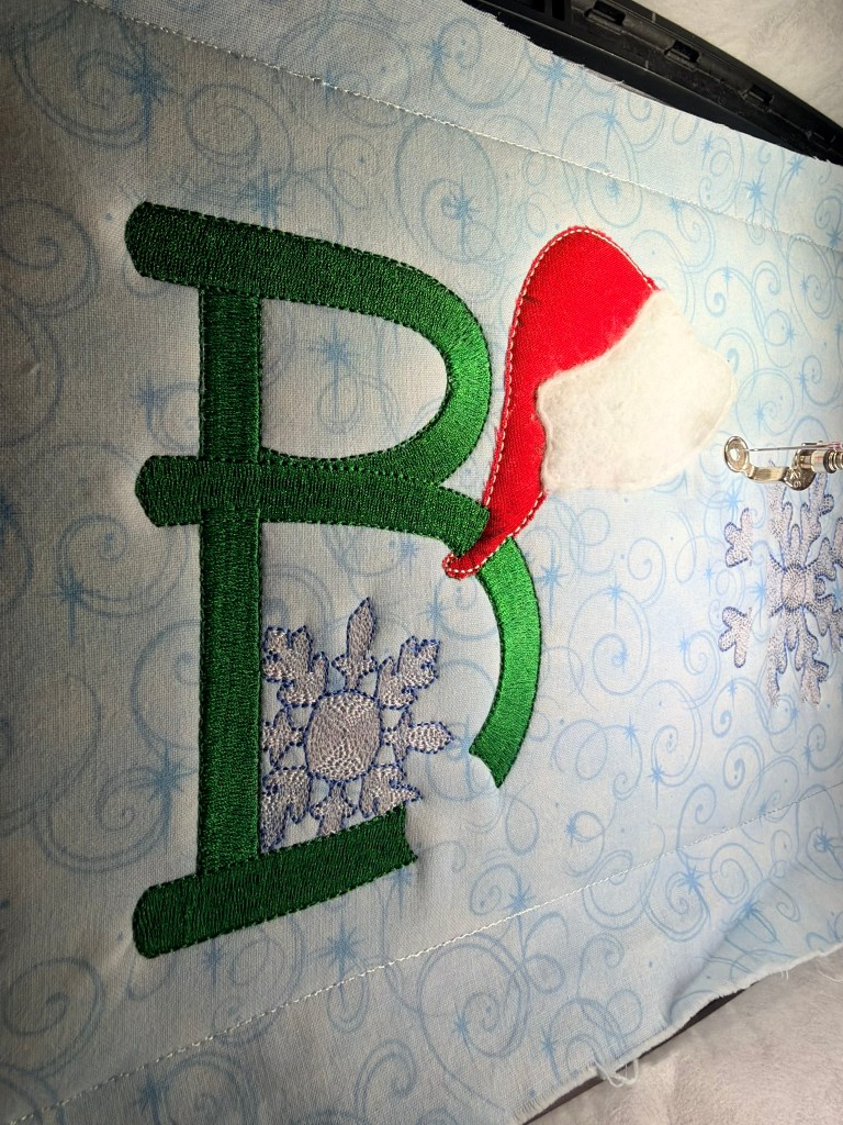 I have also been working on a little Christmas quilt that will end up as a gift. My embroidery machine has been hard at work for days! This letter B took 65 minutes of stitching all by itself. I now have all the embroidery done and hopefully this little wall-hanging will be finished by end of day.