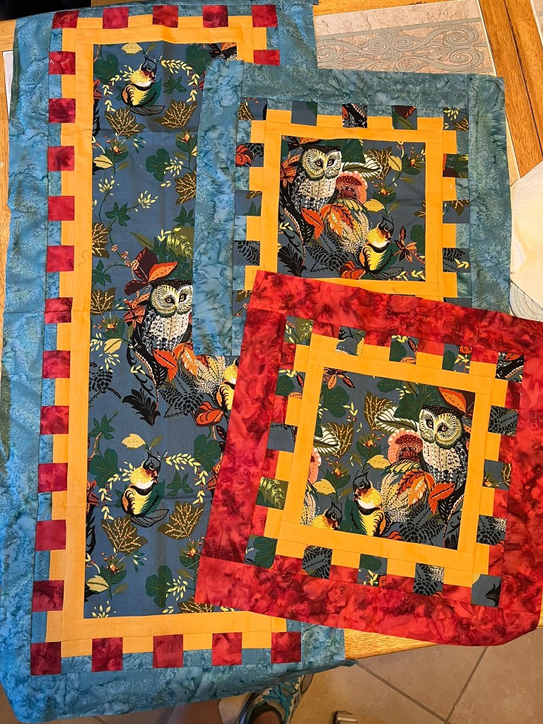 6. These table runner and placemats have been quilted and just need binding. Miles and miles of binding- my least favorite part.