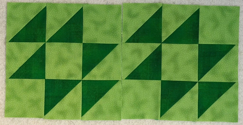 Here are my March blocks for that same donation. Again, simple but stunning. Can’t wait to see how the light green/ dark green quilts will come out.