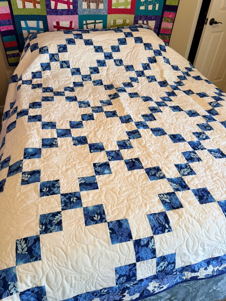 It was a blue that was meant for another project, but it matched perfectly and who knows when the other project will have its beginning, so this one is ready to go. The quilt turned out to be the perfect size for our guest bed.