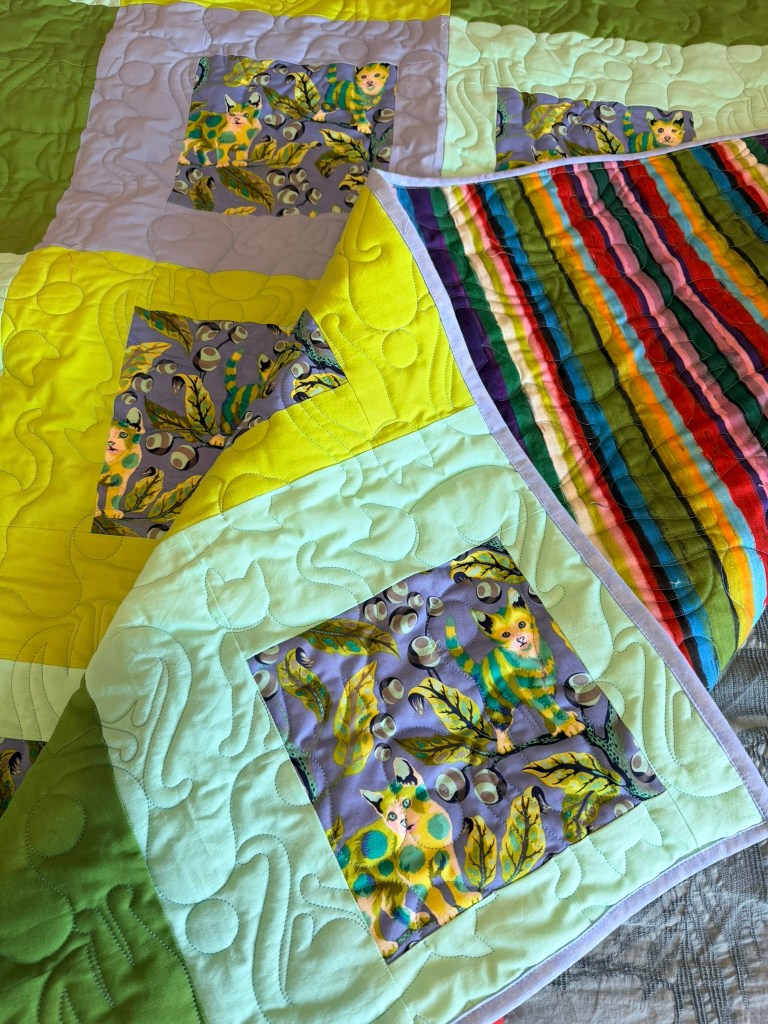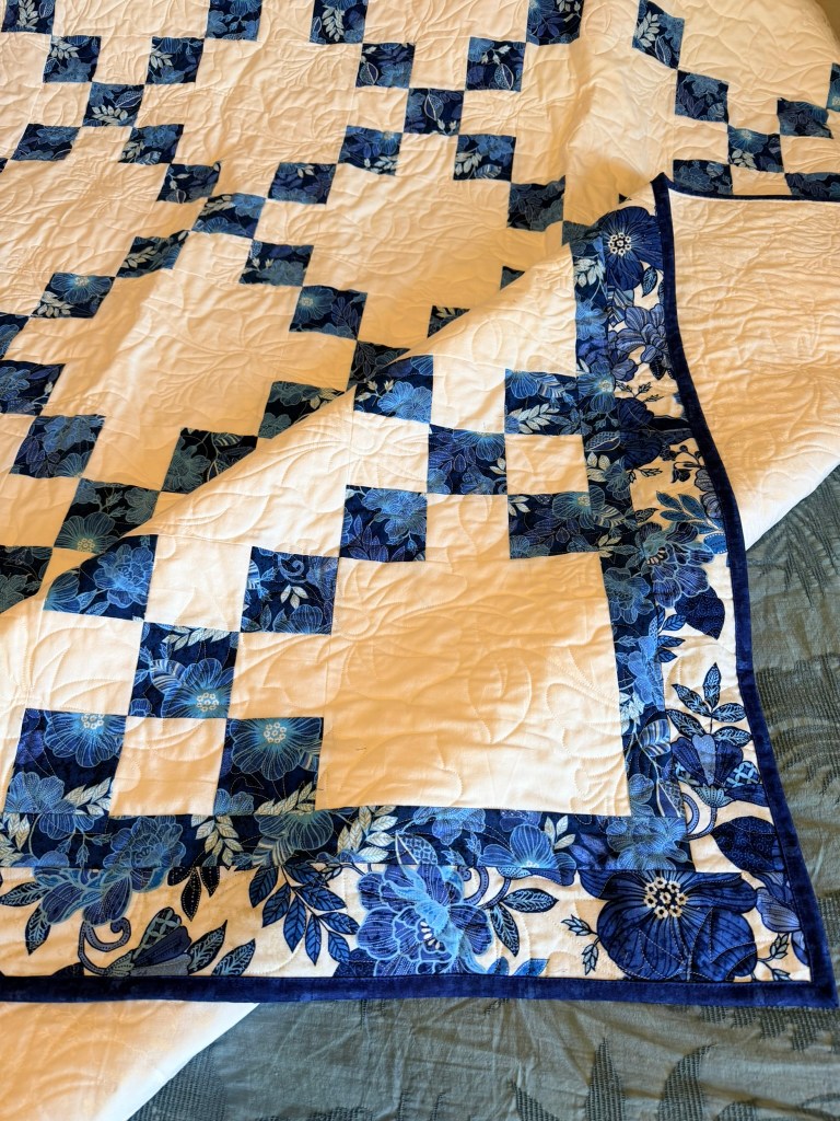 This simple quilt just awaited a binding and since the show and tell for next week’s meeting is Nine Patch quilts, it needed to make its appearance. So, thankfully I had some fabric on hand that worked out.
