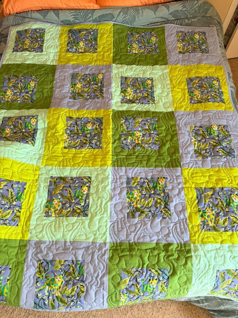 I came up with this lovely, cloudy blue that needed a purpose, so the quilt is now complete and has been mailed off to be loved. My daughter’s roommate is recovering from surgery and is definitely a cat lover! Between the two of them, they have 3 cats and a dog. This found it’s purrrfect destination and should arrive today…
